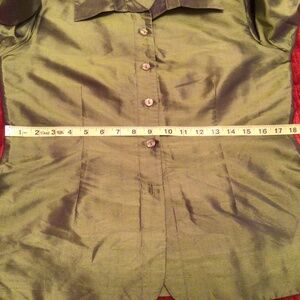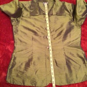 Favorite find! Stunning olive green pant suit, light and liquidy, with a subtle metallic shine to it.