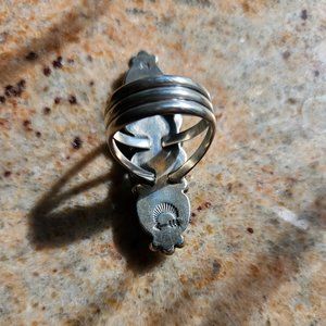 American Southwestern Vintage style design with 4 beautiful Kingman turquoise stones. Striking bold blue color with slight golden-brown matrix. Hand polished Rustic looking patina and high shine finish. Triple split style shank/band. Hand stamped tribal rising sun and tiny arrow Hallmark on backside.