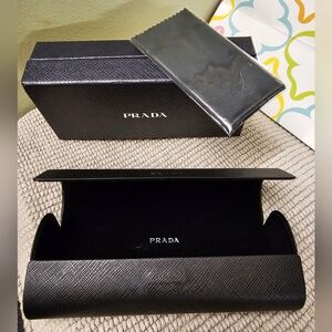 New in Box Prada Eyeglass case in black with hardshell snap closure and Eyeglass cleaning cloth, can use for sunglasses or eyeglasses. In new condition no wear or callouts giftable set. Ships from smoke-free and pet free home. Box measures 6.5 inches by 3 inches. Case is dome shaped 6 inches by 2.5 inches. Cleaning cloth is New sealed in package.