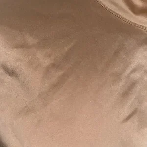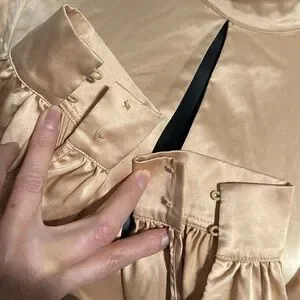 Badgley Mischka champagne satin blouse shirt top XS 2…from Rent the Runway PLEASE NOTE: repair piece…light snagging throughout, small hole and scuffing on right shoulder, missing buttons at sleeves…zipper works great. Msrp $275
