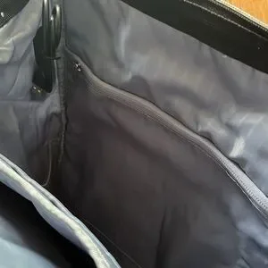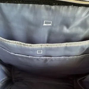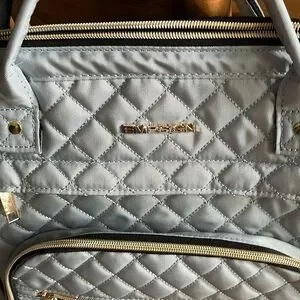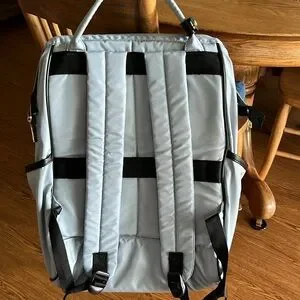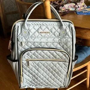 New Light blue, big opening for easy access, lots of pockets , charging cord, padded straps, double handle on top, beautiful quilted fabric, two side pockets for water bottles or umbrellas. New without tags. 17” high, 12” across, 4.5” width of bottom.