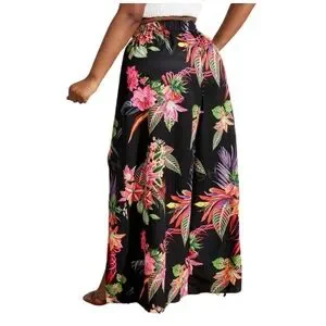 Wide leg multicolor colorful bright tropical floral flower black pink green orange white tassel flowy boho bohemian baggy loose casual fun festival concert office summer spring elastic drawstring business beach pool vacation resort resortwear wrap tie slit split