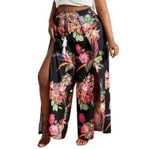 Lightweight and flowy wide leg pants with elastic waist and drawstring. The partial wrap high slit front makes these tropical floral beauties perfect for summer or as a beach coverup