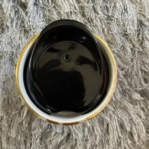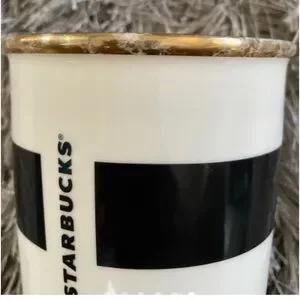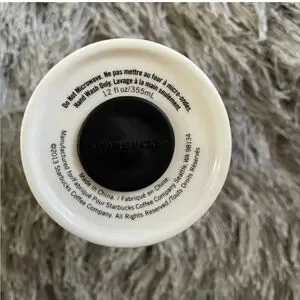 It’s a glass Starbucks cup and has some scratches near by the rim at the top of the cup. It can hold 12 fluid oz.