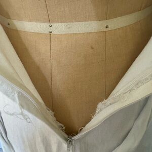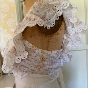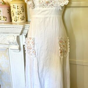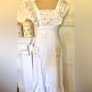 Beautiful size small cotton dress by capital CONTEMPOCASUALS. Prairie style, romantic, garden, maybe even for a wedding! Please read the description. You are buying a vintage garment and I am doing my best to describe and do close-ups of every part of the dress. The zipper has a little fraying at the sides, but is still firmly attached to the dress. I could not get the zipper up all the way on my dress form in one picture but the zipper works fine. I see no stains, rips or tears. The ruffle is a little wrinkled, but will steam out perfectly as well as the sash that ties in the back. It has great polyester Roset pockets with lace and polyester rosette bodice with lace also on the sleeves. The top of shoulder to waist line is 13 1/2 inches. Pit to pit across the front is about 17 inches , and waist lying flat side to side is 14 inches. From the bottom of the waist line to the hem of the dress is 38 inches.