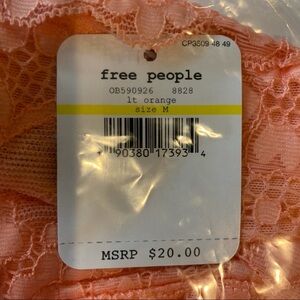 Free People Galloon Lace Halter Bralette. Stretchy and soft halter Bralette with a plunging neckline. Mesh lining and scalloped trim. Slip on. Double hook and eye closure in back. Brand new with tags, sealed. Color: light orange. Size medium.