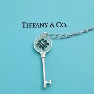 This is a beautiful Tiffany & Co. blue enamel open knot key flower pendant in a rare 30" sterling silver oval chain.