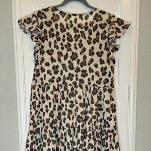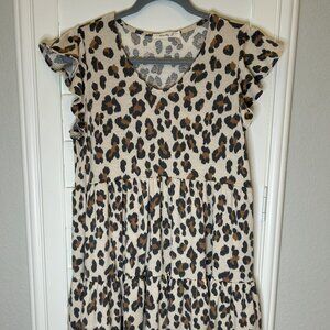 This is a flutter sleeve, leopard print knit dress by Lovely J. This is new without tags in a size small. It has a layered ruffle style that is flowy.