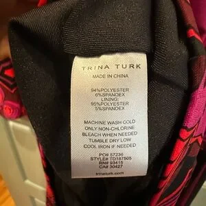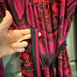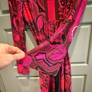 A swirling, '60s-inspired print enlivens a split-neck Trina Turk dress chicly tied at the waist for definition.