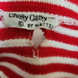 Some outfits are Mattell (turquoise dress, shirts set, red coat). CCMc in brown corduroy outfit "Chatty Cathy Mc" (my last name first 2 letters initials). Elastic and/or snaps need to be replaced in several outfits. There are a few other clothing items not pictured.