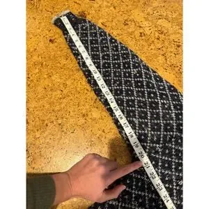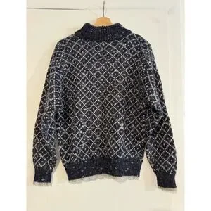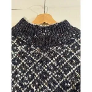 Navy blue with a marled sprinkle knit diamond pattern. Crew neck, ribbed hem and cuffs