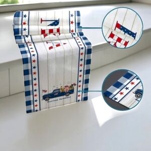 13"×90" blue farm truck american farnhouse table runner. Poly blend. Machine washable. Stain resistant. New in original factory packaging.
