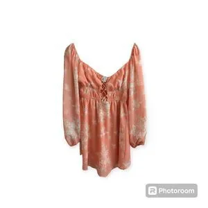 Get ready to turn heads in this stunning Sweet Harmony Romper from Hello Molly. This beautiful orange floral romper features long balloon sleeves, a scoop neckline with lace-up closure, and a flattering wide-leg design. Perfect for any occasion, whether it's a party, cocktail night, or a casual day out, this romper is made of 100% polyester chiffon fabric that's lightweight and sheer.