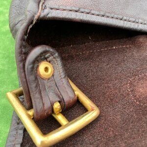 Exterior has some darker patina in spots either due to wear and or stains. Two of what look like scratch marks, one on the front and one on the back of exterior. Front scratch marks are more rounded bumps with one tiny hole. Back scratch marks are more rounded bumps with some flaking. There are two small tears in the piping by the strap hardware that haven't been repaired. Some wear marks on the piping of the flap from the strap hardware. One strap rivet was reinforced and I trimmed that up to look nicer. Strap is in overall good condition with two of the holes being more stretched out than others and some hardware patina marks.