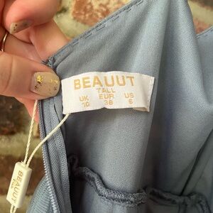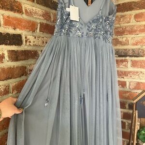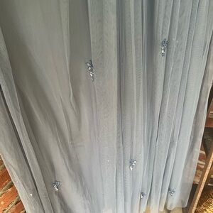 Beautiful dusty blue gown with tulle overlay and beaded detail on skirt and top. Never worn; US size 6. Includes original tags and repair kit