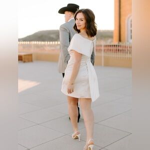 Excellent condition ivory satin dress with off the shoulder details. The dress is not see through and can be worn without a bra 🙌🏻 This was worn for a couple hours for engagement pictures