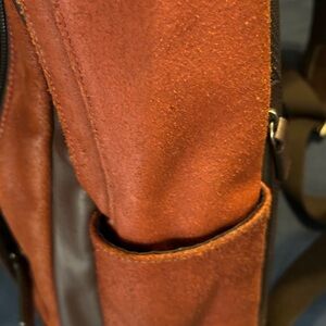 Vintage Coach brick colored men’s backpack. Perfect for daily wear and has a unique color. Four exterior pockets and handle at the top and two in the interior. Handle at the top. 18 inches high, 13 inches wide and 6.5 inches deep. Wear and tear: in great condition with some scratches on front panel and bottom leather. Also one zipper pull missing. All reflected in the images. No trades.