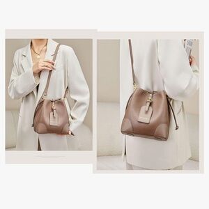 Taupe colored bucket bag in excellent used condition. Five pockets inside: two compartments, two zip pockets, and one slip pocket. Gold Hardware. Soft leather. Actual product photos from 6th onward.