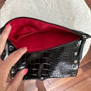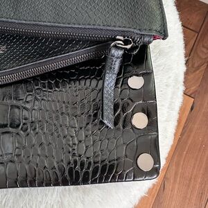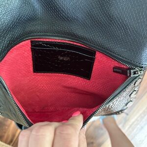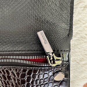 The Hammitt Dillon Snake Print Leather 6-Way Flap Small Crossbody Black Bag is a versatile and stylish accessory for women. Made of leather and rayon fabric, it features gunmetal hardware and studded accents. The bag has an adjustable crossbody strap and a zip closure. It is perfect for travel, workwear, or casual occasions. The snake print and vintage style add a touch of uniqueness to the bag. Unable to locate dustbag and authenticity card.
