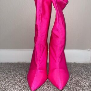 Fashion nova neon pink bootie , comes in its original box and each bag for each shoe. Comes with additional heel tips . never worn small stain on material price is negotiable