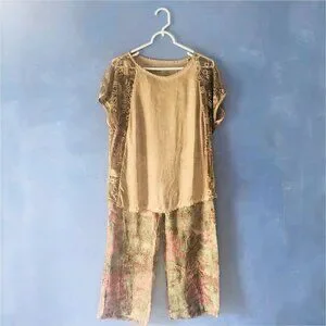 This lovely top is one size fits all and was bought in a fashion boutique in Italy. The body of the blouse is semi sheer, the sheer sleeves and side panel have a beautiful floral design. Never worn. The color is between tan and green. Very light weight. If you are looking for unique piece - this is it! In brand new condition, never worn. Matching pants available in my closet (last photo shows the complete outfit). Offers welcome
