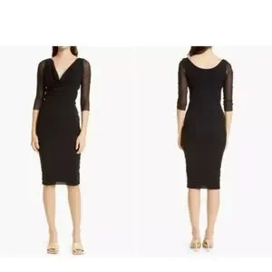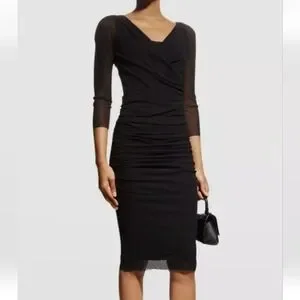 Fuzzi Black Draped Cowl Neck Sheer 3/4 Sleeve Mesh BodyCon Dress.