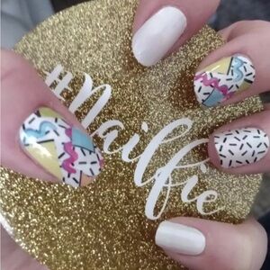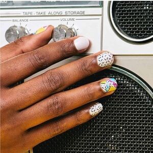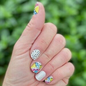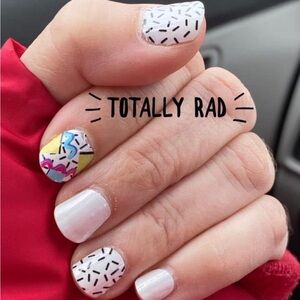 New in package Color Street nail strips. Retired “Totally Rad” is a nostalgic pearl-finish mix of sprinkles, squiggles, and shapes. This set is new and sealed, but does not include the outer packaging. I will include a nail file and alcohol prep pad with purchase.