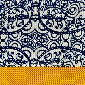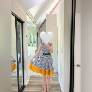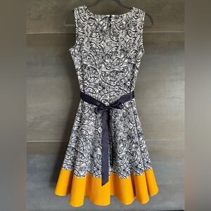 - Elegant navy patterned dress with yellow hem