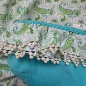 Paisley print rash guard and turquoise bikini bottoms with adorable crochet detail on back.