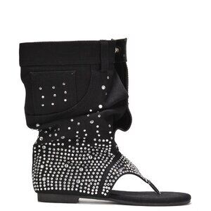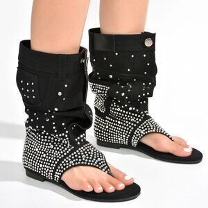 NEW๐ฅ Rhinestone Embellished Slouchy Jean Sandals Mid-Calf Boots Thong Open Toe