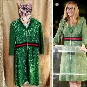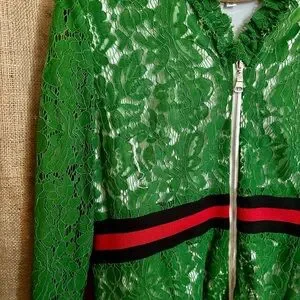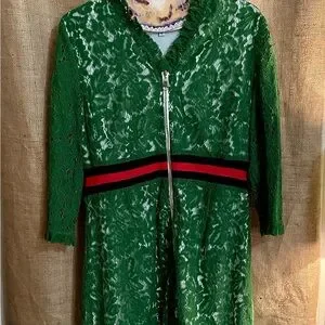 Beautiful Kelly green ๐ lace dress with navy and red ribbed band/zips in front!
