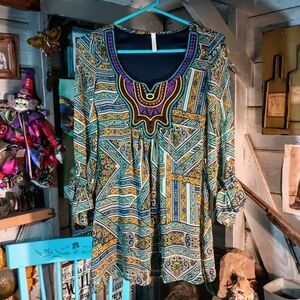 near new, cezanne Bohemian style, sheer mini dress with lining except for the 3/4 ruffled sleeves. love the colors. very cute and EUC!