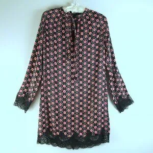 Sandro Paris Black Satin Red Floral Tie Neckline Lace Trim Mini Shift Dress