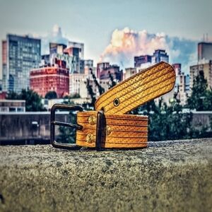 Bespoke handcrafted 1 1/4 rubber feeder firehose belt with artisan crafted solid brass buckle, keeper and eyelids. Belts are handcrafted to your size by a working Boston firefighter (Shannon Blair aka Jack Altrade)...the Tinkerpreneur. Spice up your wardrobe with a unique splash of color Great to pair with jeans and your casual shoe or boot of choice.