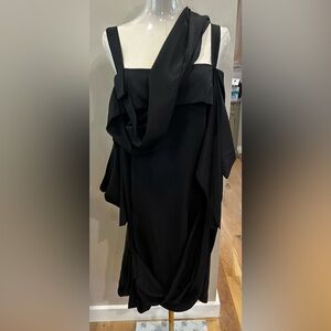Several looks in 1 dress! This Vera Wang little black dress with draped fabric in front can be worn several ways. With straps on shoulders, you can wear either with a caplet sleeve off the shoulder or not. Drape it with attached fabric or wear it asymmetrical with one shoulder. This is 100% silk. Loose fit like a shift dress.