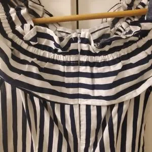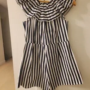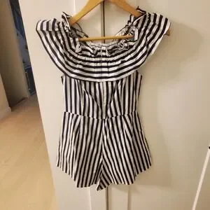 Gorgeous Navy & White striped shorts Jumper/ romper with cute ruffled detail collar/sleeve can be worn off shoulder or on shoulder, stretchy. Cool, crisp, cotton fabric, lightweight, Purchased in Bali, never got to wear it too small for me. Brand new. Ladies Size 6 would comfortably fit anyone from size 4-7. Shakuhachi brand, zipper back.