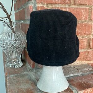 Gray wool front (business side) with a stretchy knit cotton back (party side) that’s long enough to cover your ears and neck for warmth. Front has a black and silver metal button accent. Inside is a black quilted cotton lining.