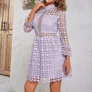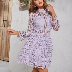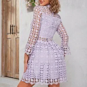 Mauve Purple Elegant Women's Stand Collar Lace Hollow Out Dress