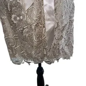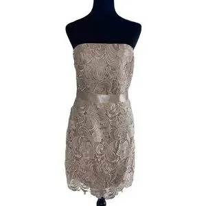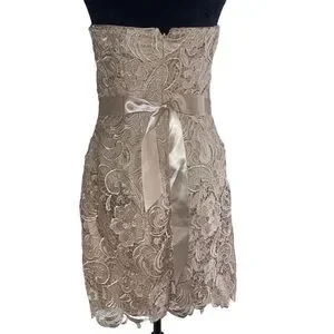 Beautiful champagne lace overlay sheath dress. Like new condition. Size 8. Satin ribbon belt.