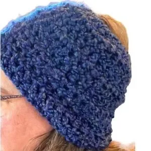 Lovely comfy soft relaxed fit cap or head wrap has marled yarn with blues like royal blue, cobalt blue, and a lighter baby blue head band.