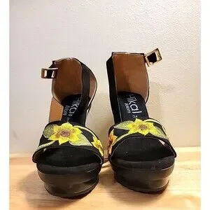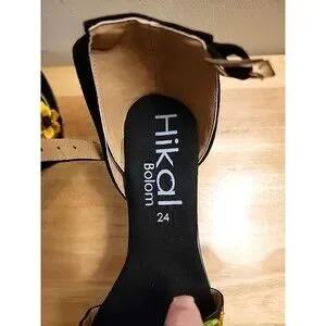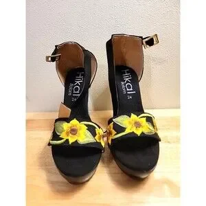 Elevate your style with these stunning showstopper NWOB Hikal Bolom handmade floral embroidered stiletto heels from Mexico. Perfect for any formal occasion, these shoes feature a beautiful floral pattern and an open toe design with a buckle closure. The ultra-high heel measuring at 4 inches and higher provides a comfortable fit for any season, whether it's summer, fall, or spring. These black strappy shoes are a must-have for any women's wardrobe, with their unique design and handmade accents. The Hikal Bolom brand is known for its quality and attention to detail, making these shoes a true work of art. Don't miss out on the opportunity to add these beautiful shoes to your collection.