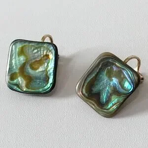 Vintage Abalone Shell Square Abstract Modernist Clip On Earrings Gold Tone