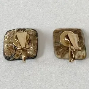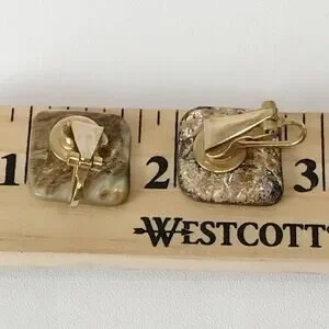 Vintage Natural Abalone Shell Square Abstract Modernist Clip On Earrings Gold Tone