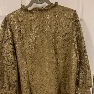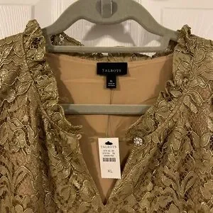 Talbots gold lace top, XL, NWT. 3/4 sleeves, 14” zipper on one side, ruffle at neckline and lace on both neckline & sleeves. Decorative faux diamond button at closure, 100% polyester shell, popover style, hand wash cold