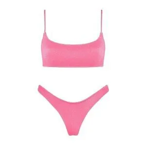 A scoop crop bikini top in pink lurex sparkle with matching bottoms. Strappy crop top with adjustable shoulder straps and back clasp fastening. CHEEKY cut bottom.