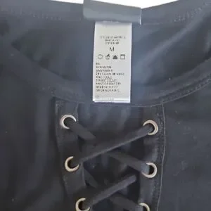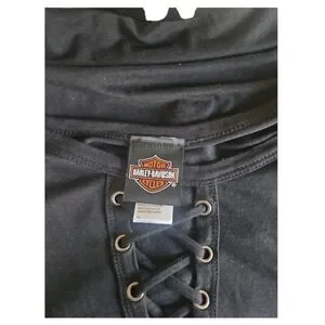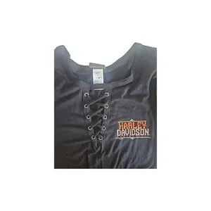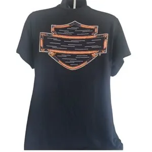 Women's Harley Davidson Short Sleeve Bling T-Shirt, Size Medium, Black, Orange and Silver. Bling Lettering on Left Chest and Large Logo on Back. 95% Spandex 5% Rayon, PTP 17.5 inches, Length 25.5 inches. Stretchy, Lace-Up, V-Neck, Not New but in Great condition.