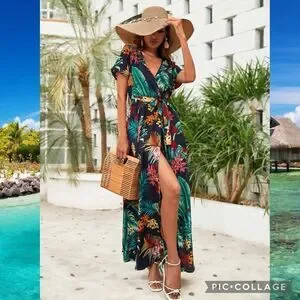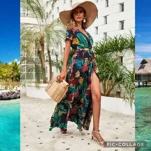 Boho Floral Maxi Open Leg Wrap Belted Dress Size Medium