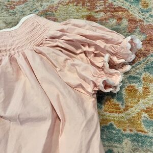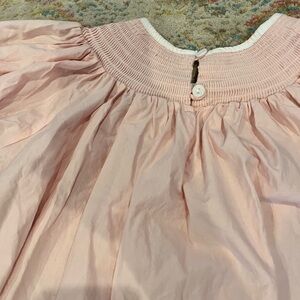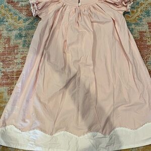 Washed and worn once! Such an adorable, sweet look for Easter with smocked bunnies and flowers at the neck line. Light pink with white scalloped edges. So classic and preppy. We loved this for Easter! Size 6 could fit a 7 too. 100% can be dressed up or down.