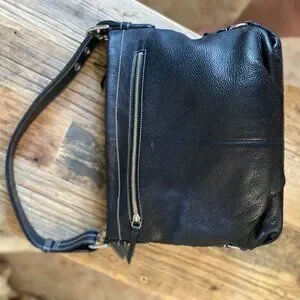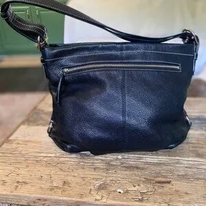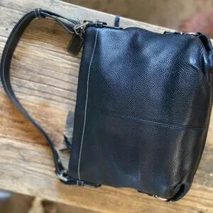 Pre-loved Coach shoulder bag, black pebbled leather, adjustable strap, zip top, zip outside and inside pockets, silver hardware. No rips or holes, normal wear. Minor scratches on outside-blue ink marks on the inside of the outside zip, a few small marks on inside fabric. Overall good condition... This is a great bag!