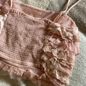 This adorable top that can be either a halter top or a tank top has a beautiful frilly chic lace Runching in back for comfort. Removable straps. NWOT.
